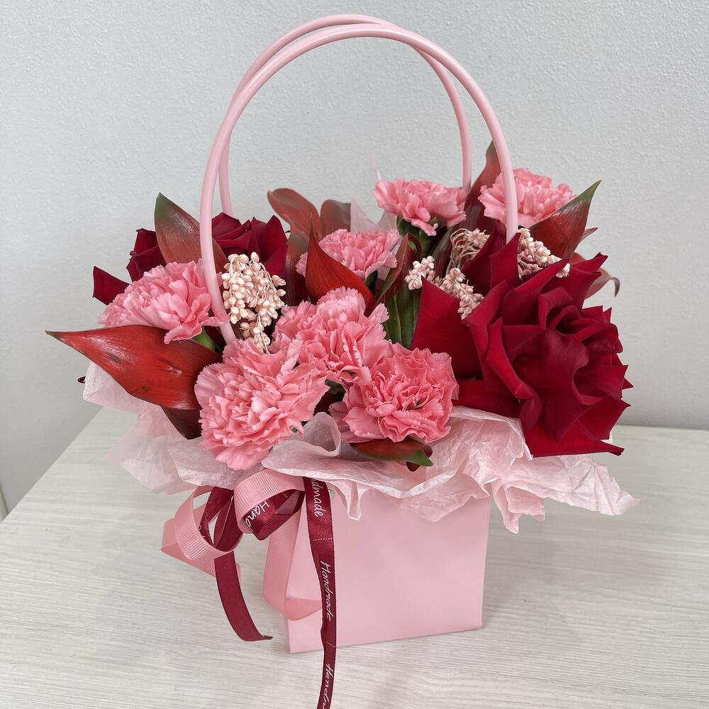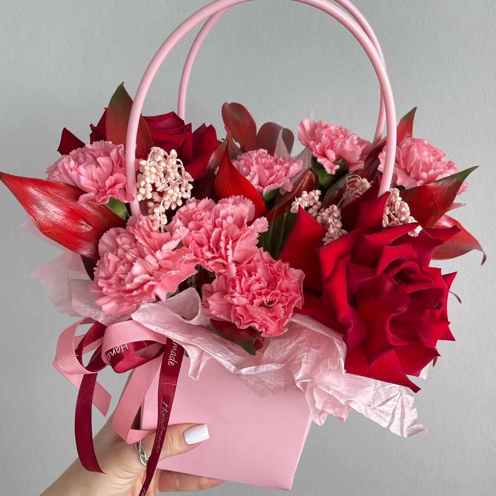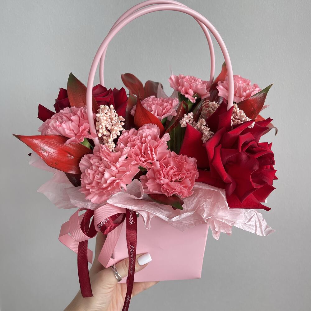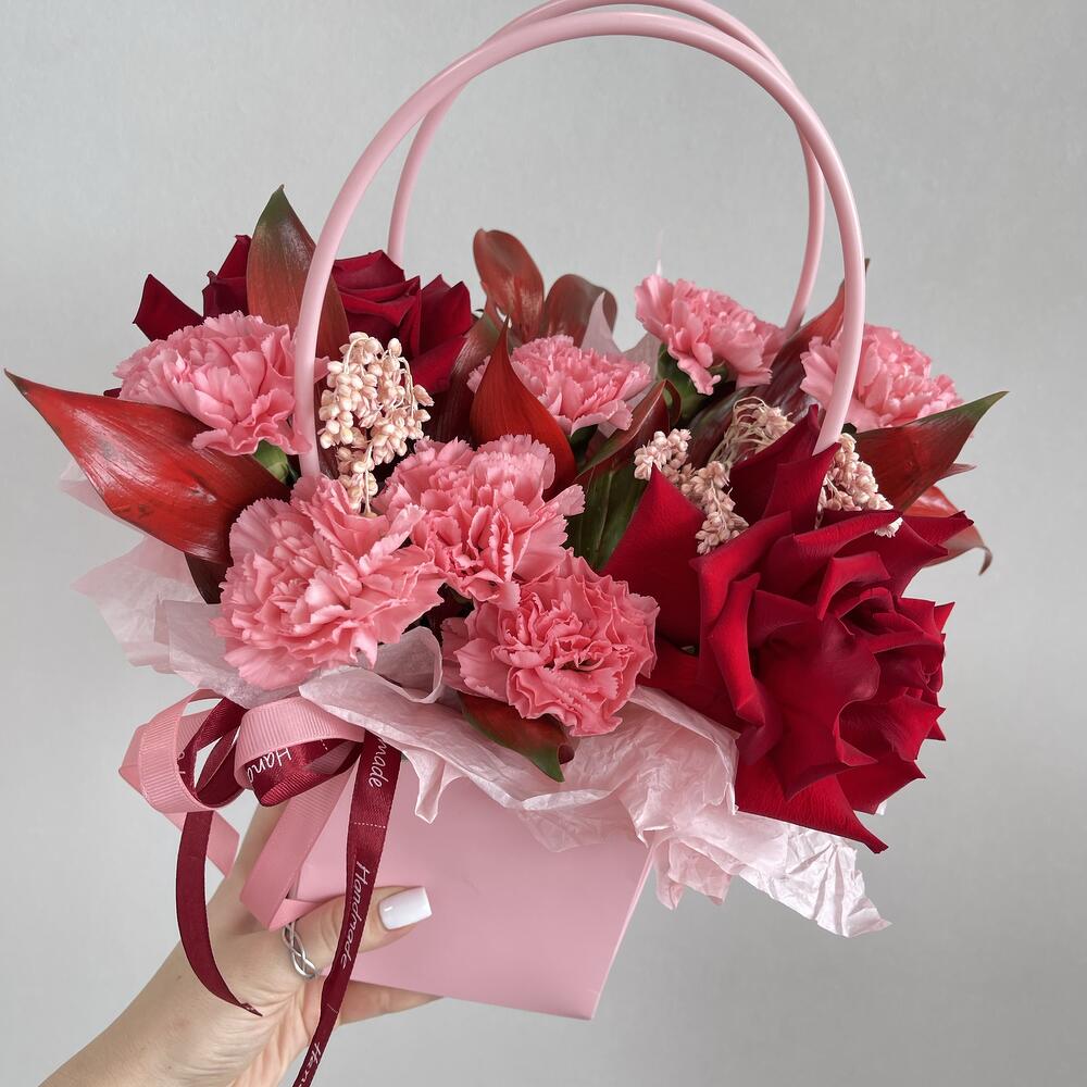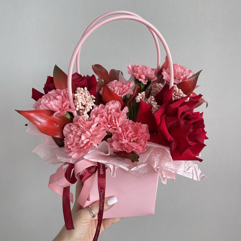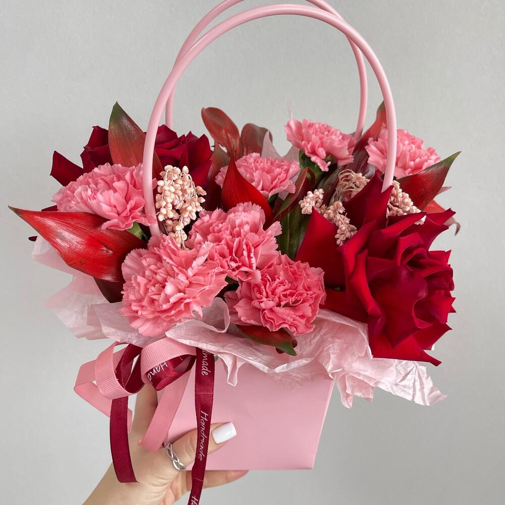 ДИАНТУС РОЗОВЫЙ И ФРАНЦУЗСКАЯ РОЗА В СУМОЧКЕ С РУСКУСОМ в Осинниках